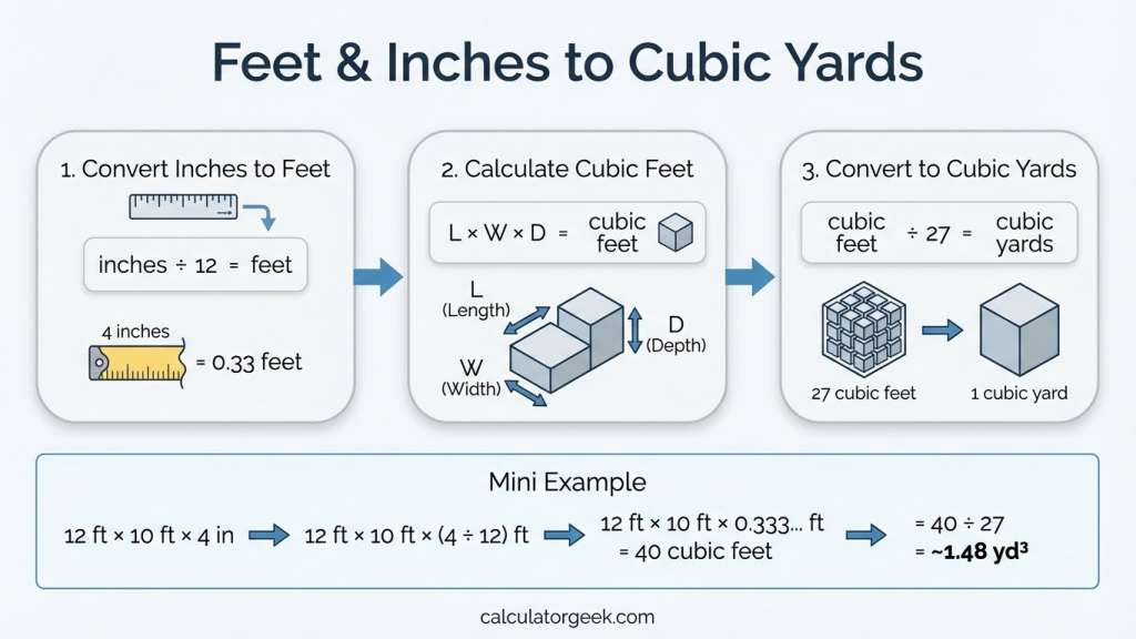 - Convert inches-based dimensions to feet first (divide each inch measurement by 12), then calculate volume, then divide by 27 for cubic yards.