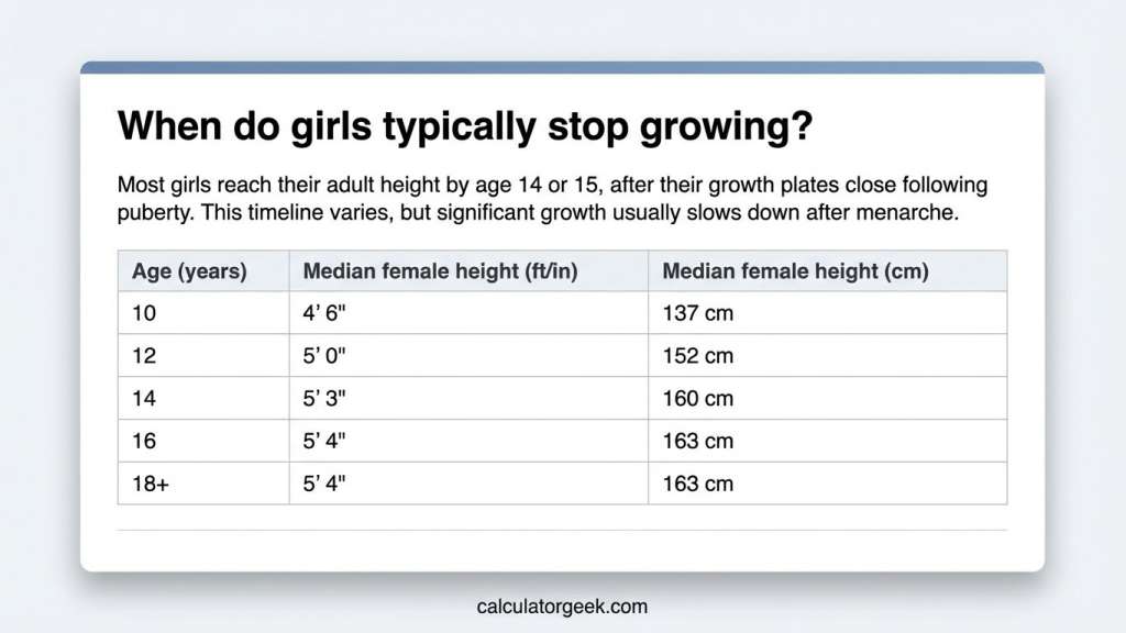 Many users land on a height page with a very specific question: when do girls stop growing? The honest answer is that there isn’t one universal age that applies to everyone—but there are clear patterns seen in growth charts. In general, growth tends to speed up earlier during adolescence for girls, then gradually slows as the body approaches full maturity. That’s why many girls reach their near-adult height earlier than boys.